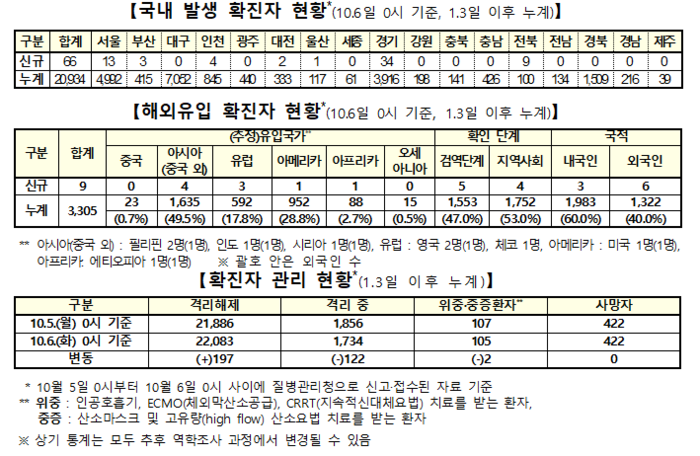 질병관리청 중앙방역대책본부(본부장:정은경 청장)는 6일 0시 현재, 국내발생 신규 확진자는 66명이 확인됐고, 해외유입은 9명이 확인돼 총 누적 확진자수는 2만4239명(해외유입 3305명)이라고 밝혔다.