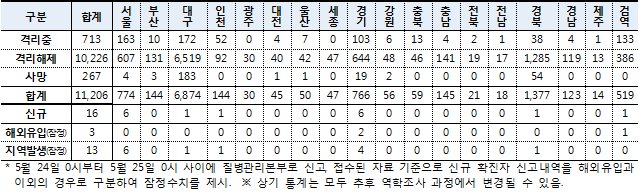 질병관리본부 중앙방역대책본부(본부장 정은경)는 25일 0시 현재, 신규확진자가 16명 발생해 총 누적 확진자수는 1만1206명(해외유입 1215명·내국인 88.2%)이라고 밝혔다.
