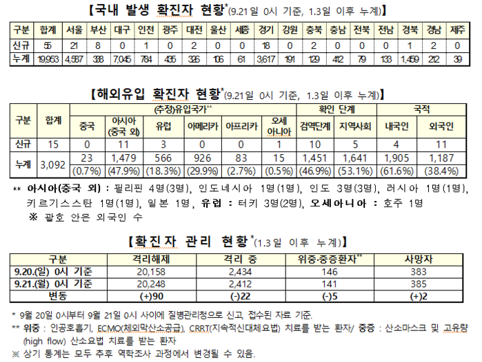 질병관리본부 중앙방역대책본부(본부장 정은경)는 21일 0시 현재, 국내발생 신규확진자는 55명이 확인됐고, 해외유입은 15명이 확인돼 총 누적 확진자수는 2만3045명(해외유입 3092명)이라고 밝혔다.