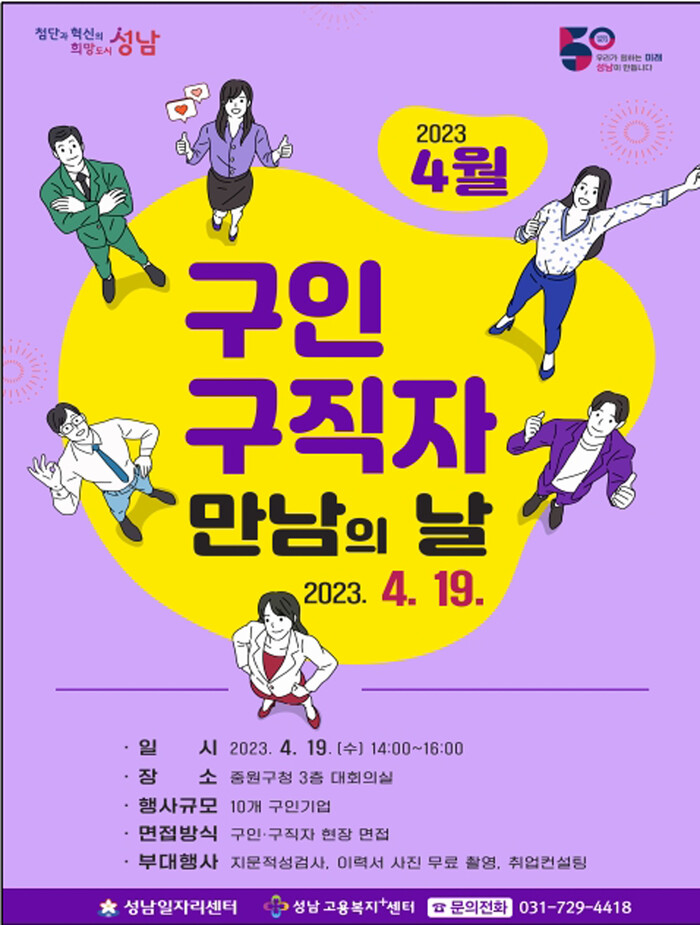 [로컬세계=김병민 기자]경기 성남시는 오는 19일 중원구 성남동 중원구청 3층 대회의실에서 ‘4월 구인·구직자 만남의 날’ 행사를 연다.