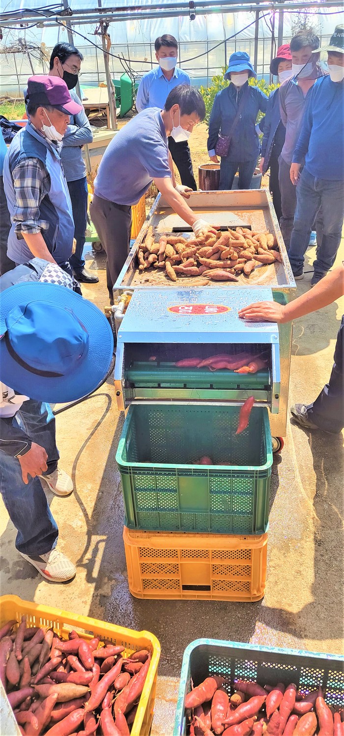 또 다른 시연은 구근 전용 세척기로 표피에 상처가 살짝만 생겨도 상품성이 떨어지고 쉽게 상하는 고구마에 필요하지만 가격이 비싸서 농가에서 구입하기 힘든 농기계이다. 공기방울이 진동하면서 한번에 1톤 이상씩 척척 닦아주는 세척기 있다면, 고령화된 농촌에서 젊은이 만큼 반갑고 귀하다며 세척 모습을 지켜보던 회원들은 환하게 웃었다.