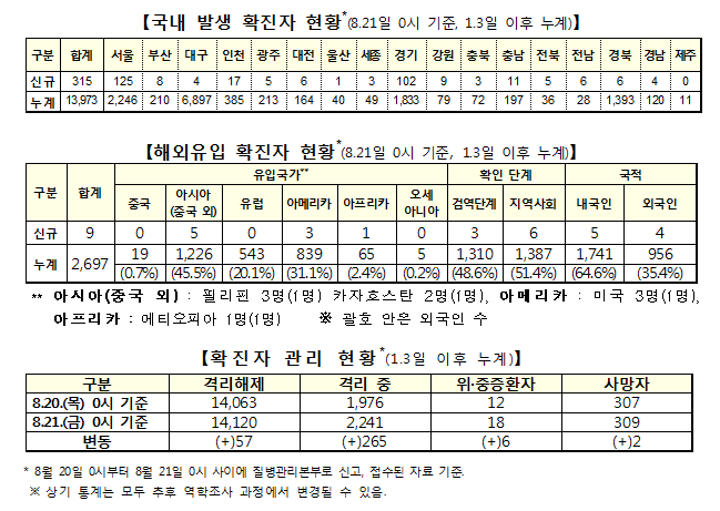 질병관리본부 중앙방역대책본부(본부장 정은경)는 21일 0시 현재, 국내발생 신규확진자는 315명이 확인됐고, 해외유입은 9명이 확인돼 총 누적 확진자수는 1만6670명(해외유입 2697명)이라고 밝혔다.