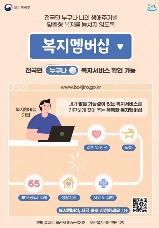 예를 들어, 미혼인 30대 직장인 A씨가 복지멤버십에 처음 가입을 하면, 소득재산조사결과를 통해 결혼초기에는 아이돌봄 서비스, 아동수당 등을 안내하고, 만약 사고나 질병이 났을 경우에는 재난적의료비 지원 안내, 부모가 65세 도래의 경우에는 기초연금 안내 등 생애주기별로 중요 순간마다 필요한 복지서비스(76개 사업)를 알려준다.