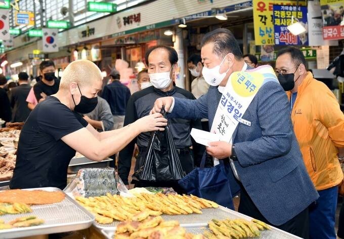 | ▲ 전통시장 찾은 김경일 시장. 파주시 제공 |