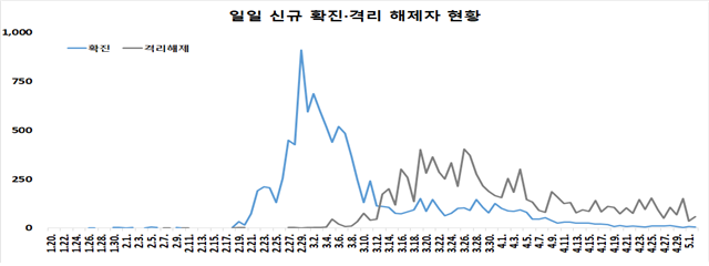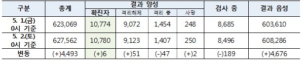 질병관리본부 중앙방역대책본부(본부장 정은경)는 2일 0시 현재, 총 누적 확진자수는 1만780명(해외유입 1081명·내국인 90.5%)이며, 이중 9123명(84.6%)이 격리해제 됐다고 밝혔다.