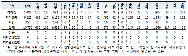 ◆지역별 확진자 현황 (5.2일 0시 기준, 1.3일 이후 누계)