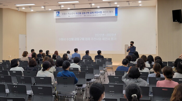 ▲지난 22일 열린 학교급식 수산물 공동구매 업체 추천사업 제안서 평가회 모습. 수원시 제공 |
