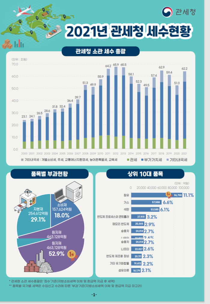 관세청(청장 윤태식)은 수입 물품에 대해 통관 단계에서 관세청이 부과·징수하는 세금(이하 ‘관세청 소관 세수’)을 세목·품목·국가·FTA협정별로 분류한 '관세통계연보'를 최초로 발간해 21일 공표했다.