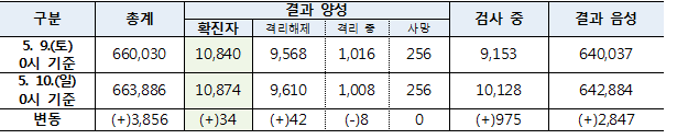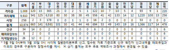 질병관리본부 중앙방역대책본부(본부장 정은경)는 10일 0시 현재, 총 누적 확진자수는 1만874명(해외유입 1127명·내국인 90.3%)이며, 이중 9610명(88.4%)이 격리해제 됐다고 밝혔다.
