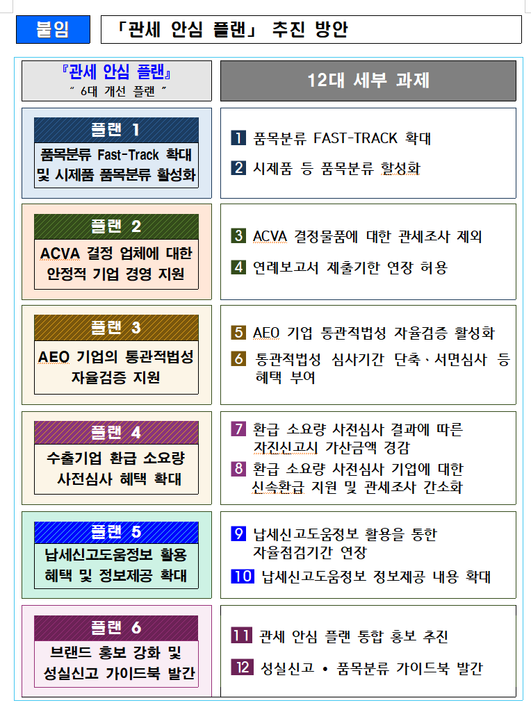 ‘관세 안심 플랜’은 관세청이 운영 중인 각종 예방적 사전점검 제도를 하나의 통합 브랜드로 묶은 것이다. 납세자가 관세 신고 내용을 사전에 점검하고, 불확실성을 해소할 수 있도록 지원하는 데 초점을 맞췄다. 관세청은 사전심사 제도의 활용을 확대해, 사후에 발생하는 대규모·일시 추징으로 기업 경영에 부담을 주는 상황을 예방한다는 방침이다.