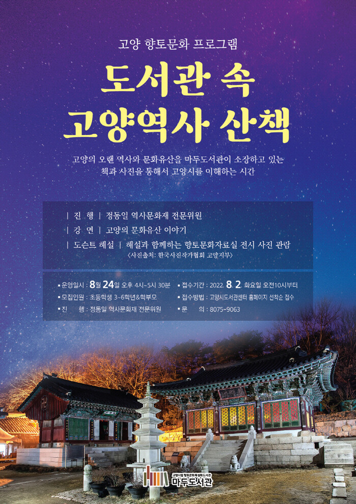 [로컬세계 = 이영원 기자]경기 고양특례시 마두도서관이 다음달 24일 도서관 강의실 및 향토문화자료실에서 ‘도서관 속 고양역사 산책’을 운영한다고 29일 밝혔다.