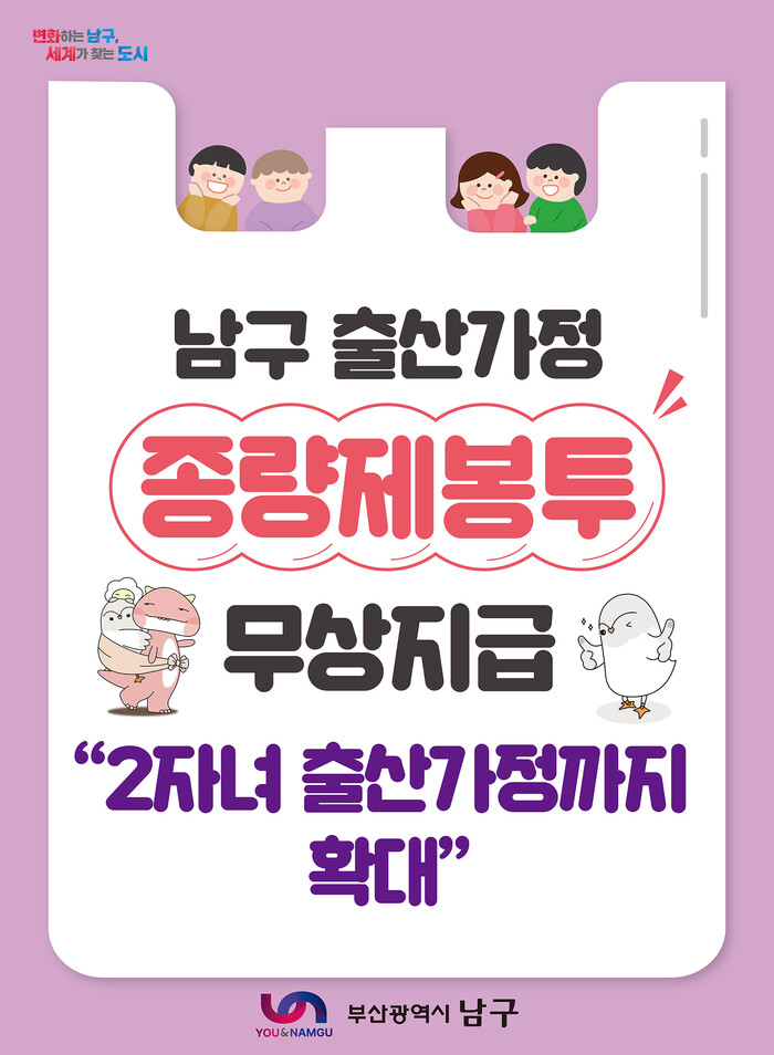 [로컬세계 부산=맹화찬 기자]부산 남구(구청장 오은택)는 민선8기 남구의 핵심 정책 중 하나인 ‘따뜻한 동행, 아이 키우기 좋은 남구’일환으로 시행 중인 출산가정 종량제봉투 무상지원 사업을 5월 1일부터 ‘2자녀’ 출산가정까지 확대 추진한다.