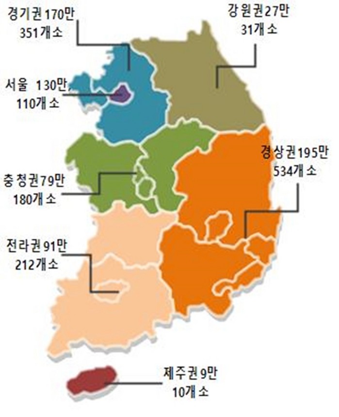 65세 이상 인구는 경상권 195만(27.8%), 경기권 170만(24.3%), 서울 130만(18.5%) 순이며 요양병원 수도 노인인구 분포와 유사하게 경상권 534개소(37.4%), 경기권 351개소(24.6%), 전라권 212개소(14.8%) 순으로 나타났다.