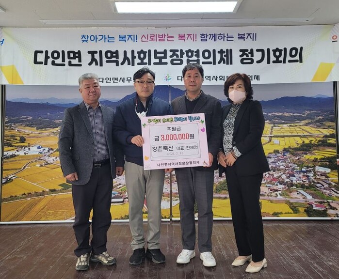 송승목 협의체 민간위원장은 “다인면의 어려운 이웃들을 생각해주시는 전재연 대표님께 감사드리며, 기탁해주신 성금은 지역복지의 발전과 도움의 손길이 필요한 소외계층을 위해 의미있게 사용되도록 최선을 다하겠다”고 전했다.