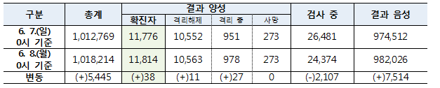 질병관리본부 중앙방역대책본부(본부장 정은경)는 8일 0시 현재, 신규확진자가 38명 발생해 총 누적 확진자수는 1만1814명(해외유입 1297명·내국인 87.0%)이라고 밝혔다.