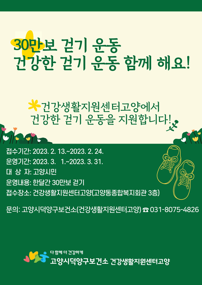 [로컬세계 = 이영원 기자]경기 고양특례시 건강생활지원센터에서 3월 1일부터 운동 습관 기르기 걷기 프로그램을 운영한다.