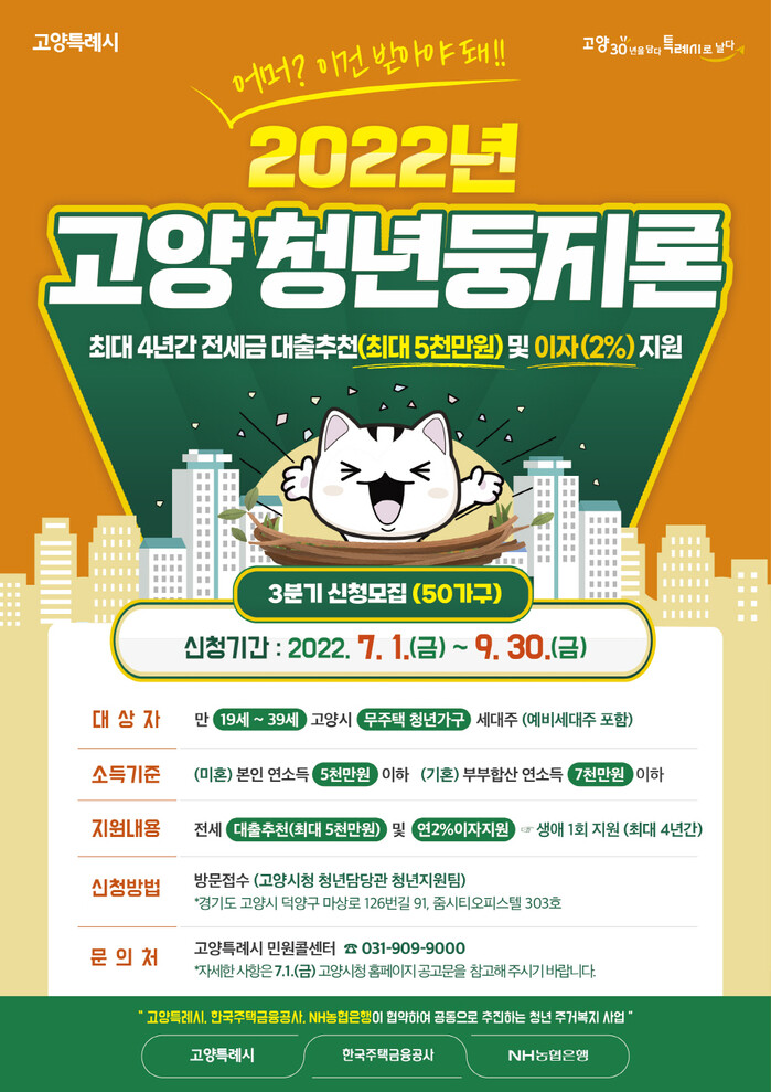 [로컬세계 = 이영원 기자]경기 고양시(시장 이동환)가 1일부터 ‘고양 청년둥지론’ 사업의 3분기 지원가구(50가구)에 대한 신청자 모집을 진행한다.