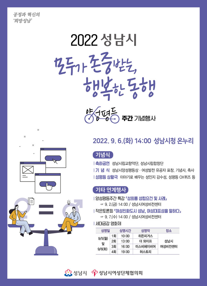 [로컬세계=김병민 기자]경기 성남시는 양성평등주간(9.1~7)을 맞아 2일부터 오는 7일까지 ‘모두가 존중받는 행복한 동행’을 주제로 다양한 시민 행사를 연다.