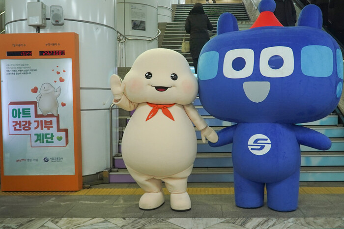 ▲지난 27일 진행된 아트건강기부계단 기부금 전달식에서 365mc의 마스코트 지방이(왼쪽)과 서울교통공사의 마스코트 또타가 기념사진을 촬영했다. [사진제공=365mc] |