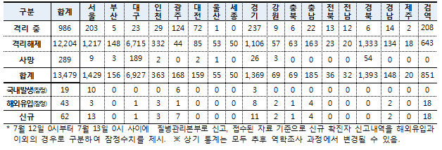 ◆지역별 확진자 현황 (7월 13일 0시 기준, 1.3일 이후 누계)