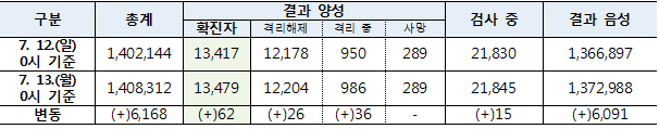 ◆국내 신고 및 검사 현황 (7월 13일 0시 기준, 1.3일 이후 누계)