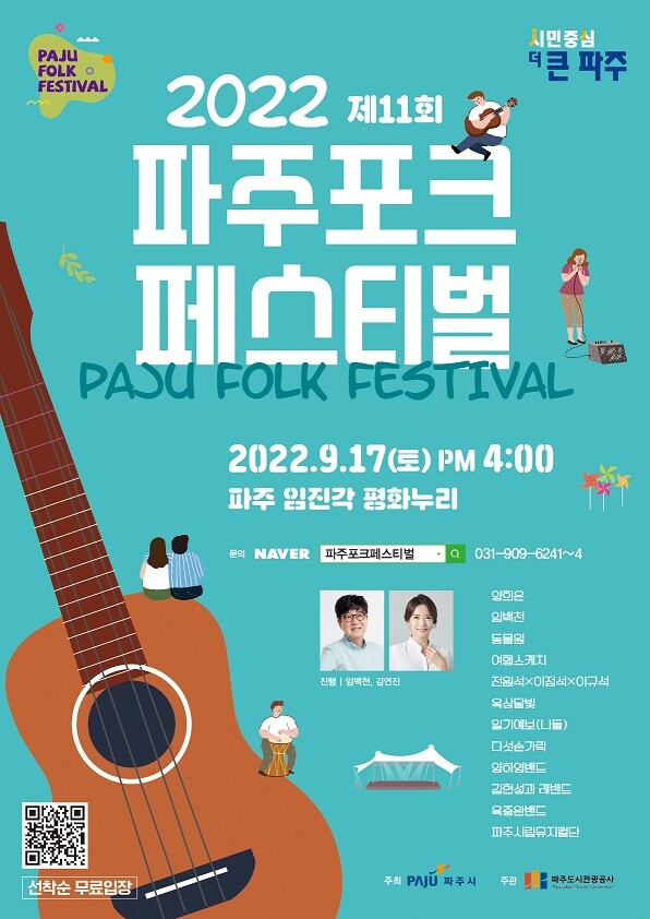올해로 11회를 맞아 파주시 대표 가을축제로 자리매김한 ’파주포크페스티벌‘은 코로나19로 3년 만에 관객과 호흡하는 대면공연으로 이뤄지는 만큼 팬데믹 이후 한층 더 풍성한 프로그램으로 포크음악의 진수를 선보일 계획이다.