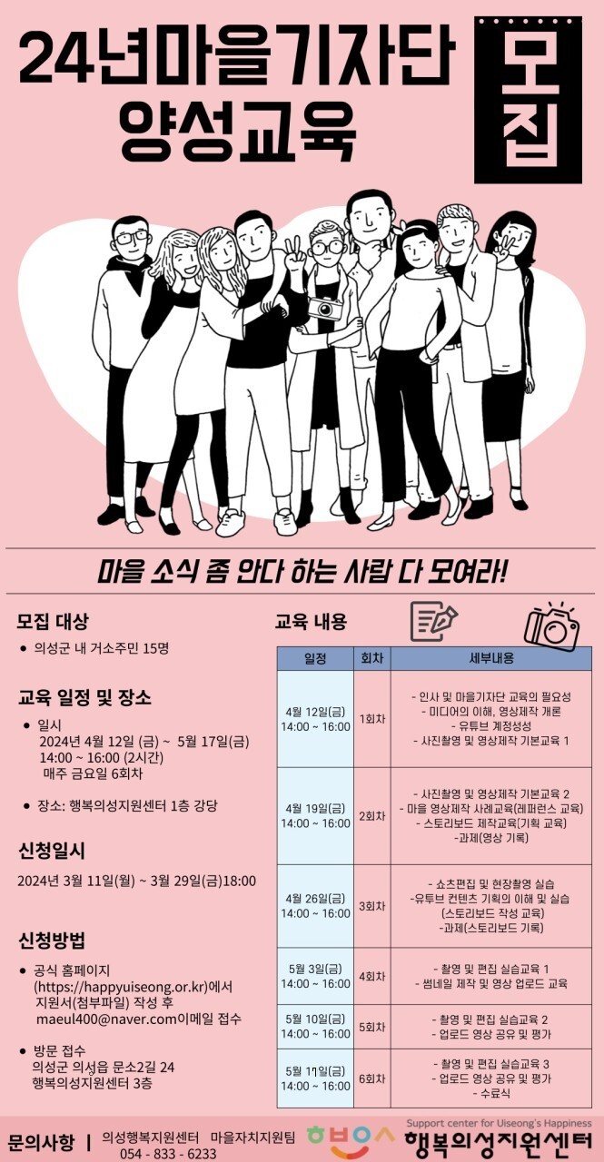 개강은 4월 12일이며, 매주 금요일 행복의성지원센터 (의성군 의성읍 문소2길 24)에서 진행될 예정이다. 또한, 수료한 교육생들은 의성군 마을기자단 활동 기회가 주어진다.
