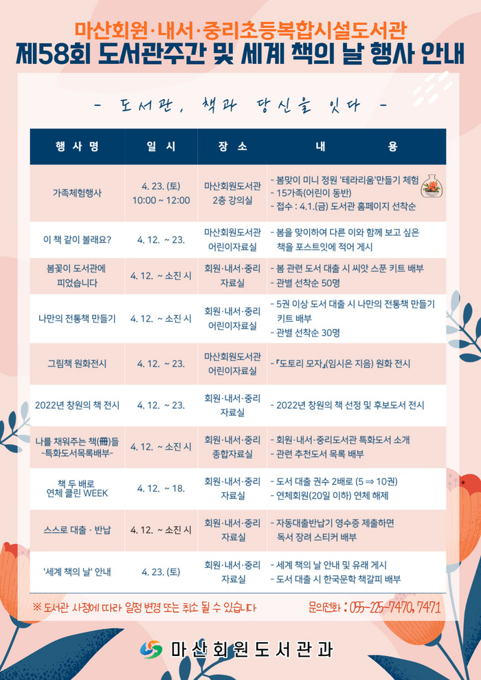 또 마산회원도서관.내서.중리초등복합시설도서관의 특화도서를 소개하고 추천하는‘나를 채워주는 책冊들-추천도서 목록 배부’, 자동대출·반납기를 이용해보는 ‘스스로 대출·반납’, ‘책 두 배로 연체 클린 Week’, ‘그림책 원화 전시회’ 등을 운영한다.