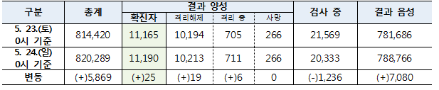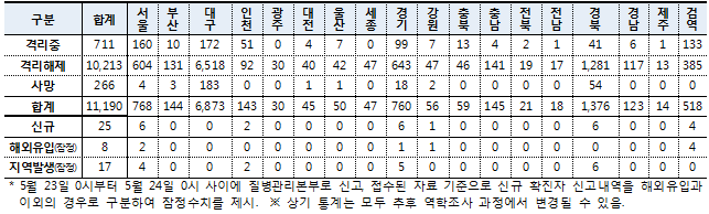 질병관리본부 중앙방역대책본부(본부장 정은경)는 24일 0시 현재, 신규확진자가 25명 발생해 총 누적 확진자수는 1만1190명(해외유입 1212명·내국인 88.2%)이라고 밝혔다.