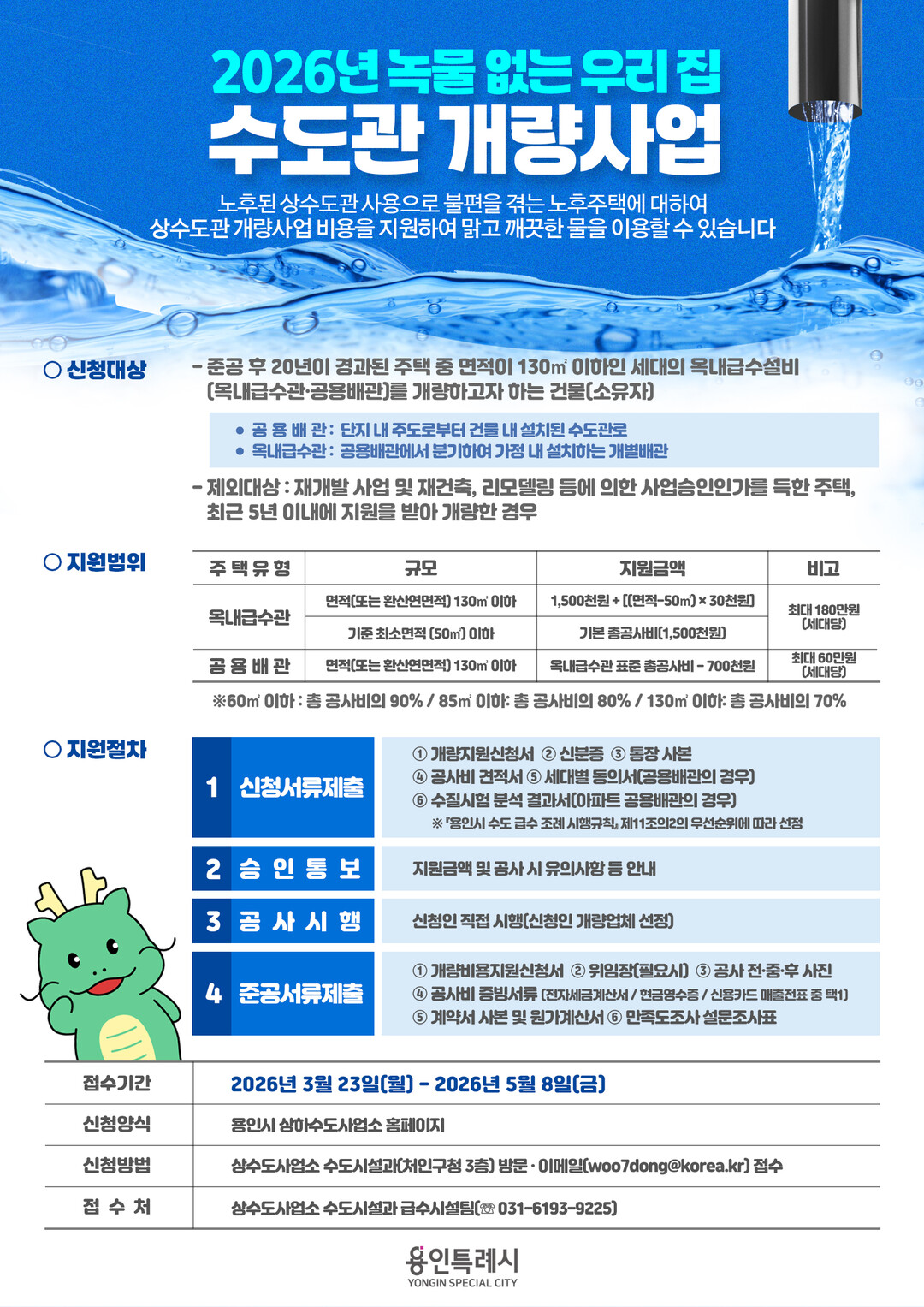 용인시는 오는 5월 8일까지 ‘녹물 없는 우리 집 수도관 개량사업’ 참여 가구를 모집한다고 밝혔다.