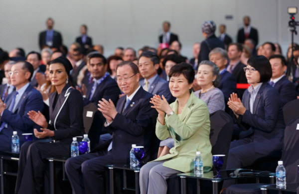 ▲ 북한이 반기문 유엔 사무총장의 개성공단 방문을 돌연 취소하며 그 배경에 관심이 모아지고 있다. 일각에서는 대외 노출에 대한 부담과 미국의 사드 관련 발언에 대한 항의성일 것이라는 분석이 제기되고 있다. 사진은 지난 19일 오후 인천 송도 컨벤시아에서 열린 세계교육포럼 개회식 참석 모습. <사진출처=청와대 홈페이지> |