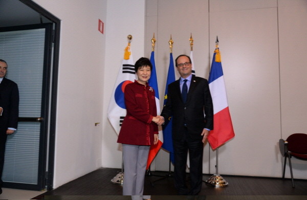 ▲ 박근혜 대통령이 지난해 10월16일 오후(현지시간) 이탈리아 밀라노 국제회의장에서 프랑수아 올랑드 프랑스 대통령과의 정상회담에 앞서 악수하고 있다.<사진출처=청와대 홈페이지> |