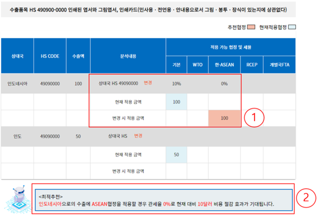 ▲ ① A사의 수출품인 그림엽서는 한국에서 품목분류 코드(HS) 4909.0000으로 수출되었으며, 인도네시아에서도 동일한 코드인 4909.0000으로 통관될 가능성이 높음. 이 경우 적용 가능한 모든 협정세율정보를 제공 (인도네시아 현지에서 기본관세율이 적용되었으나, 한-ASEAN 특혜세율 적용도 가능) ② 현재 기본관세율(10%)을 적용받는 물품을 한-ASEAN FTA(0%)를 적용했을 때 발생할 비용절감 효과 표시. FTA 최적세율 추천 서비스 예시 화면. 관세청 제공 |