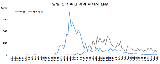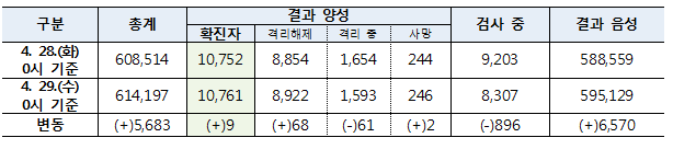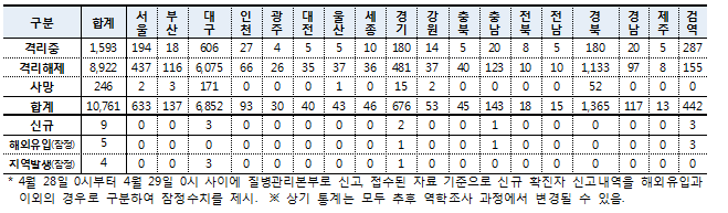 질병관리본부 중앙방역대책본부(본부장 정은경)는 29일 0시 현재, 총 누적 확진자수는 1만761명(해외유입 1061명·내국인 91.%)이며, 이중 8922명(82.9%)이 격리해제 됐다고 밝혔다.