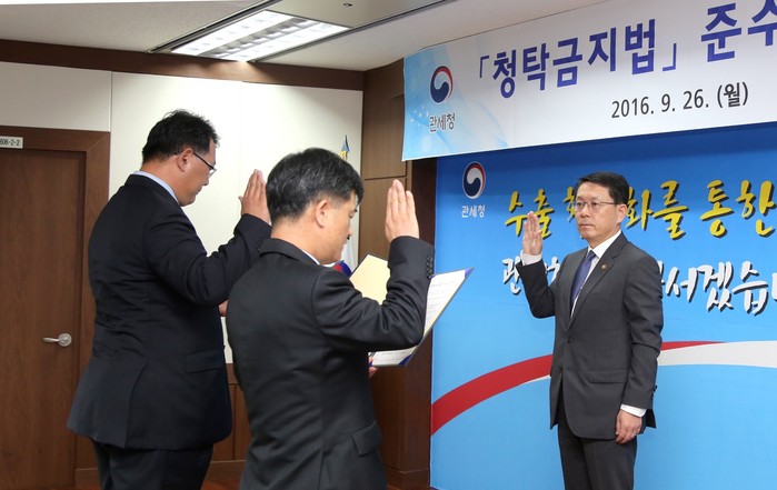 ▲26일 천홍욱 관세청장(오른쪽)과 김상현 관세청노조위원장(왼쪽), 이찬기 기획조정관이 청탁금지법 준수 선서를 하고 있다. |