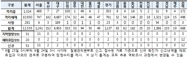 질병관리본부 중앙방역대책본부(본부장 정은경)는 24일 0시 현재, 지역사회 31명, 해외유입 20명 총 51명의 신규확진자가 발생해 총 누적 확진자수는 1만2535명(해외유입 1491명)이라고 밝혔다.