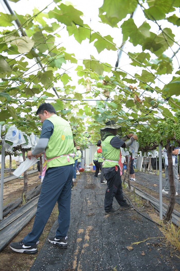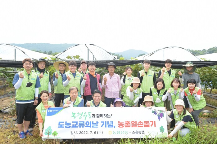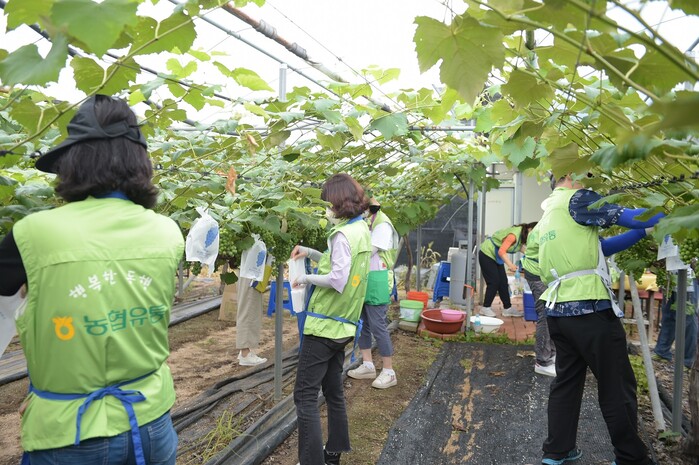 농협유통은 도농교류의 날을 맞이하여 일손이 부족한 농가에 힘이 되고자 올해 자매결연을 맺은 소흘농협의 지역 관내 포도 농가에 방문하여 포도 봉지 씌우기 등 도농교류에 앞장섰다.