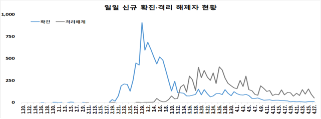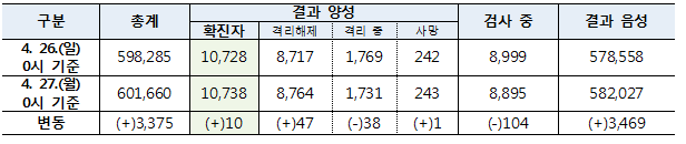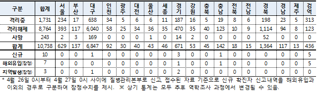 질병관리본부 중앙방역대책본부(본부장 정은경)는 27일 0시 현재, 총 누적 확진자수는 1만738명(해외유입 1,044명·내국인 91.3%)이며, 이중 8,764명(81.6%)이 격리해제 됐다고 밝혔다.