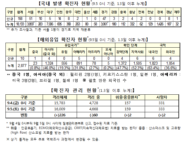 질병관리본부 중앙방역대책본부(본부장 정은경)는 5일 0시 현재, 국내발생 신규확진자는 158명이 확인됐고, 해외유입은 10명이 확인돼 총 누적 확진자수는 2만1010명(해외유입 2877명)이라고 밝혔다.