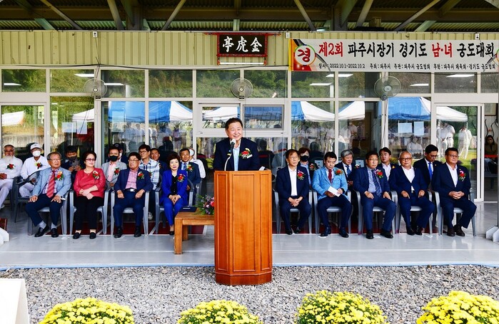파주시궁도협회(회장 심성자) 주관으로 진행된 이날 대회에는 김경일 파주시장을 비롯해 윤후덕 국회의원, 박정 국회의원, 이성철 파주시의회 의장, 선수 및 관계자 등 500여 명이 참석했다.