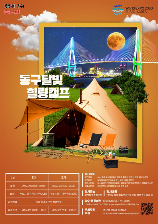 [로컬세계 부산=맹화찬 기자]부산 동구는 야영장 활성화 프로그램으로 부산항 힐링야영장 내 '달빛 힐링 캠프'를 추진한다고 1일 밝혔다.