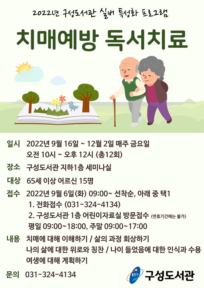 [로컬세계=김병민 기자]경기 용인특례시가 구성도서관에서 다음 달 16일부터 오는 12월 2일까지 진행하는 ‘치매 예방 독서 교실’에 65세 이상 어르신 15명을 모집한다.