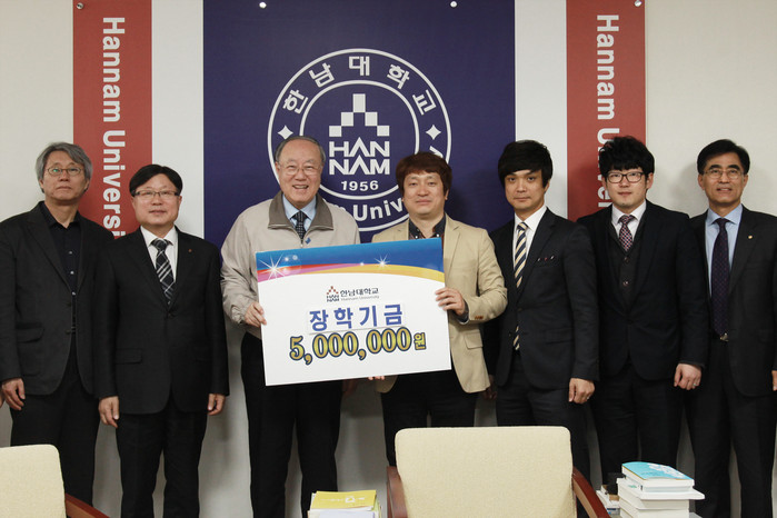 ▲14일 한남대 김형태 총장(왼쪽에서 세 번째)와 눈빛안과네트워크 이효 원장(왼쪽에서 네번째)이 장학기금 증서를 들고 기념사진을 찍고 있다. |