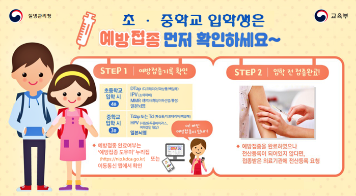 중학교 입학생은 ▲Tdap(또는 Td)(파상풍/디프테리아/백일해) 6차 ▲일본뇌염(불활성화 백신 5차 또는 약독화 생백신 2차) ▲HPV(사람유두종바이러스 감염증) 1차(여학생만 대상) 등 3종의 접종을 완료해야 한다.