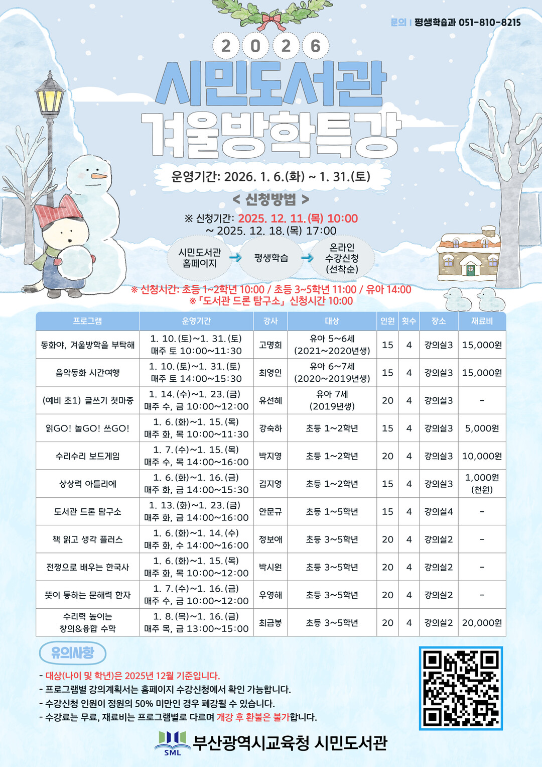 이은경 시민도서관장은 “학생들이 도서관에서 안전하고 의미 있는 배움의 시간을 보내길 바란다”며 “기초 학력과 사고력 향상을 돕는 다양한 방학 프로그램을 지속적으로 제공하겠다”고 말했다.