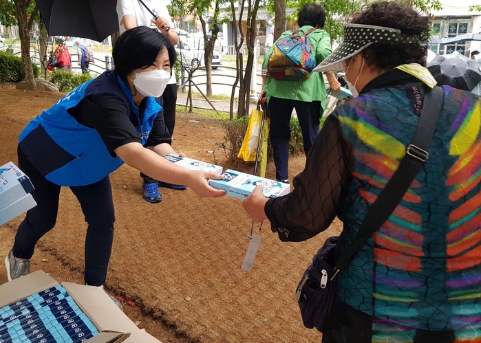 ▲자생의료재단 관계자가 지역 주민들에게 마스크를 배부하고 있다. |