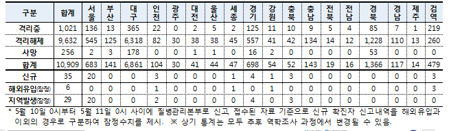 질병관리본부 중앙방역대책본부(본부장 정은경)는 11일 0시 현재, 총 누적 확진자수는 1만909명(해외유입 1133명·내국인 90.4%)이며, 이중 9632명(88.3%)이 격리해제 됐다고 밝혔다.