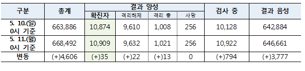 ◆국내 신고 및 검사 현황 (5.11일 0시 기준, 1.3일 이후 누계)