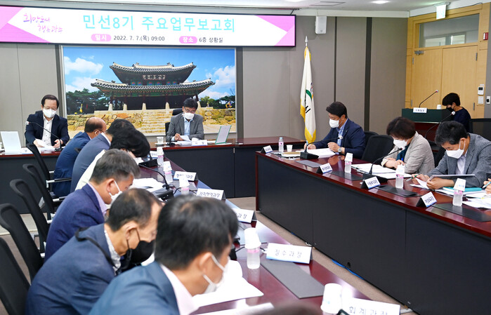 7일 시는 시청 상황실에서 방세환 시장을 비롯해 이춘구 부시장, 국‧소장 및 부서장 등 간부 공무원이 참석한 가운데 민선 8기 주요 업무보고회를 개최했다.