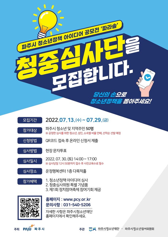 청중심사단은 파주시 청소년정책에 관심 있는 파주시민이면 누구나 참여할 수 있고, 파주시청소년재단 홈페이지 또는 포스터의 QR코드를 통해 신청하면 된다.